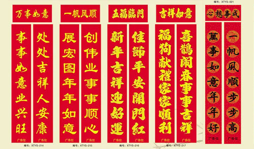 對(duì)聯(lián)是新年的必備品,家家戶(hù)戶(hù)都會(huì)貼對(duì)聯(lián)來(lái)迎候新年的到來(lái)。曾經(jīng)手寫(xiě)的對(duì)聯(lián)很多,現(xiàn)在對(duì)聯(lián)越來(lái)越多樣化,做工也越來(lái)越精美。對(duì)聯(lián)印刷廠(chǎng)各種燙金燙銀工藝的使用使對(duì)聯(lián)的藝術(shù)效果越來(lái)越高。
